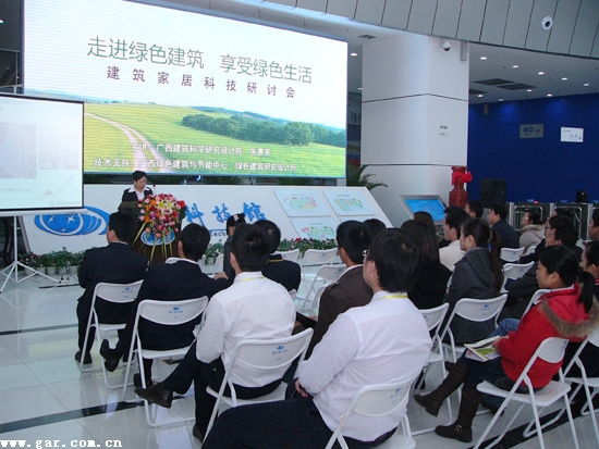 2009年2月28日,我院在廣西科技館舉辦建筑家居科技研討會(huì)。參加該研討會(huì)的有,我院教授級(jí)高工、副院長(zhǎng)朱惠英、院綠色建筑研究所高工姚照華、李云舟、余艷琴等專(zhuān)業(yè)人士。 本次研討會(huì)恰逢2009南寧家居博覽會(huì)在廣西科技館召開(kāi)。朱惠英副院長(zhǎng)做主題為“走進(jìn)綠色建筑 享受綠色生活”的學(xué)術(shù)報(bào)告,我院的高工們對(duì)聽(tīng)眾們關(guān)于綠色家居的疑問(wèn)分別做了解答。從聽(tīng)眾們的提問(wèn)可以看出,廣大消費(fèi)者對(duì)綠色建筑家居的概念表現(xiàn)出濃厚的興趣,本次研討會(huì)有助于普及綠色建筑家居的有關(guān)常識(shí),向廣大消費(fèi)者推廣了這個(gè)綠色建筑家居的新概念。