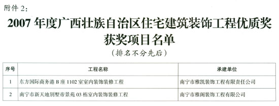 2008年10月24日,經(jīng)自治區(qū)建筑裝飾工程優(yōu)質(zhì)獎評審委員會評審,廣西桂科誠建建筑裝飾工程有限公司設計與承建的“廣西教育廳新辦公樓局部室內(nèi)裝飾裝修工程”項目榮獲“2007年度廣西建筑裝飾工程優(yōu)質(zhì)獎”。
