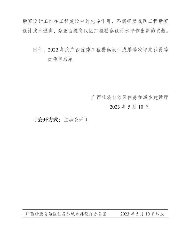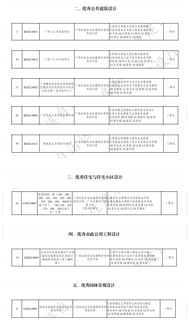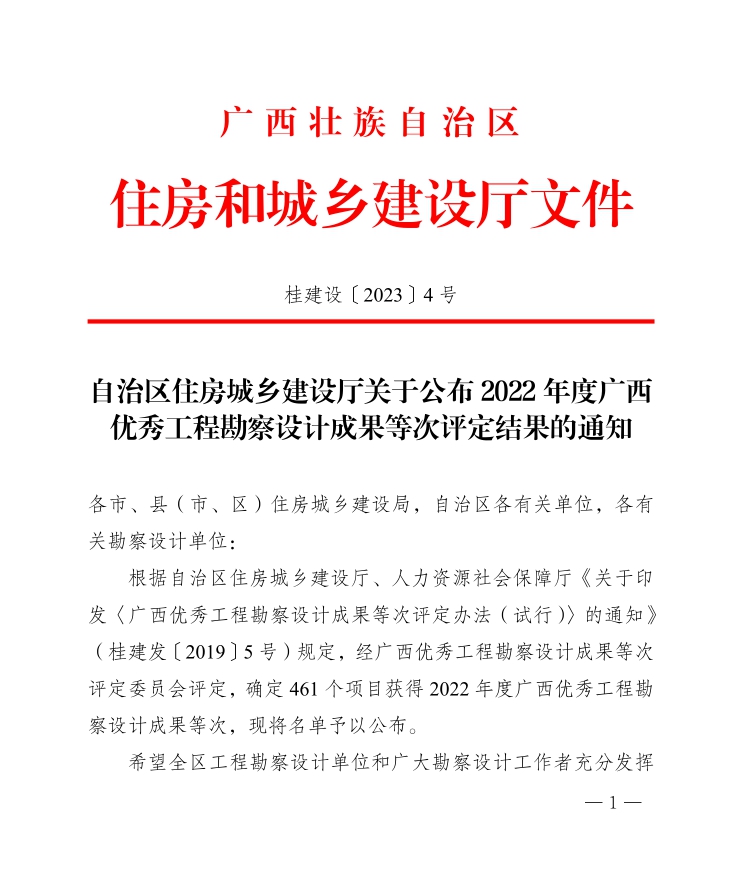 近日,自治區(qū)住建廳公布2022年度廣西優(yōu)秀工程勘察設(shè)計成果等次評定結(jié)果,我院共有8個項目獲獎,其中一等次5項,二等次2項,三等次1項。