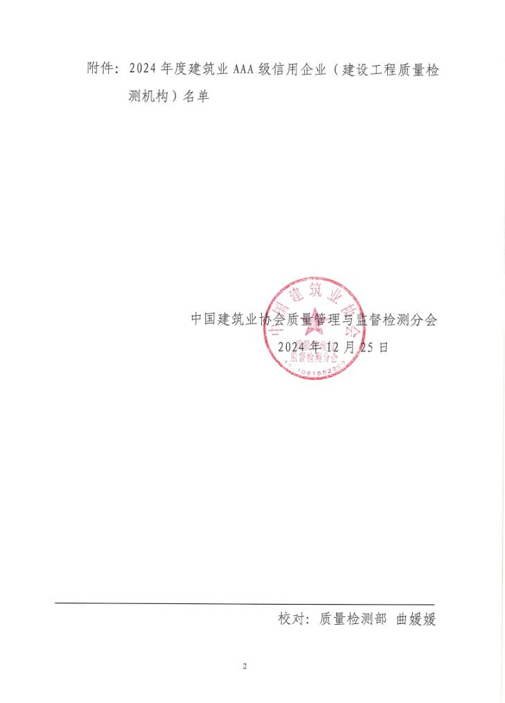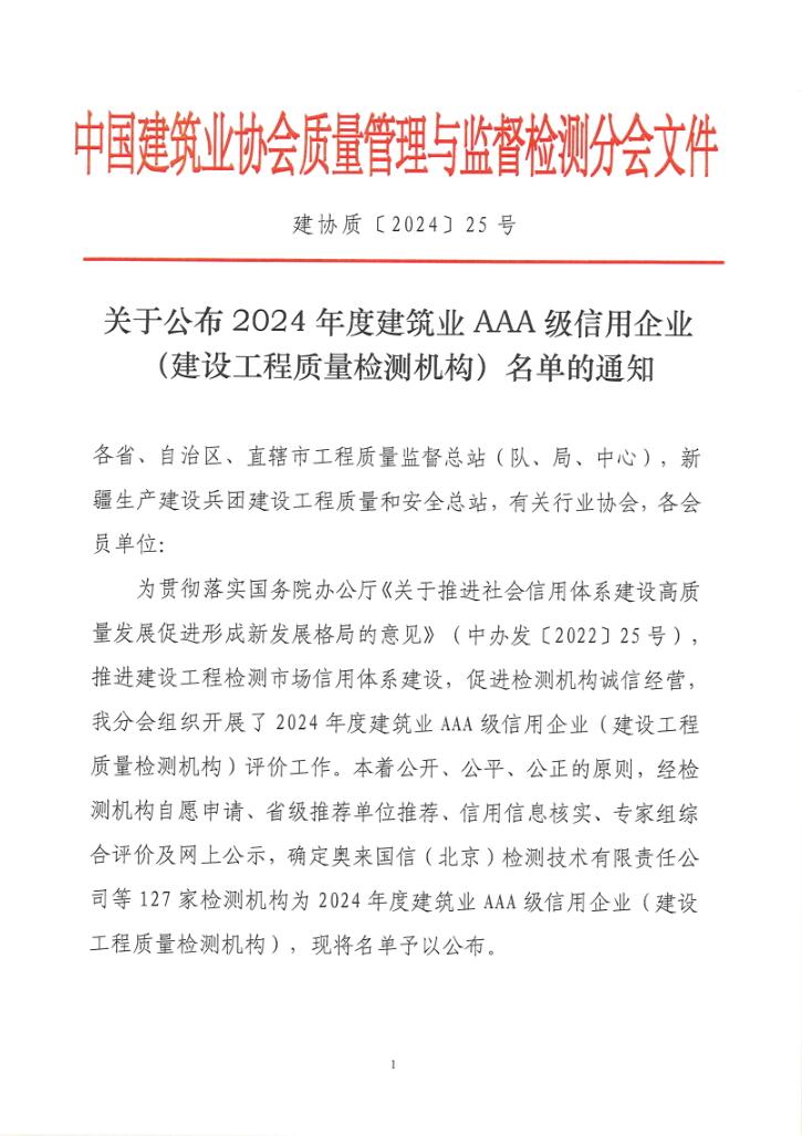 近日,中國建筑業協會質量管理與監督檢測分會公布了2024年度中國建筑業AAA級信用企業(建設工程質量檢測機構)名單,全國共有127家檢測機構榜上有名,我院喜獲此殊榮。