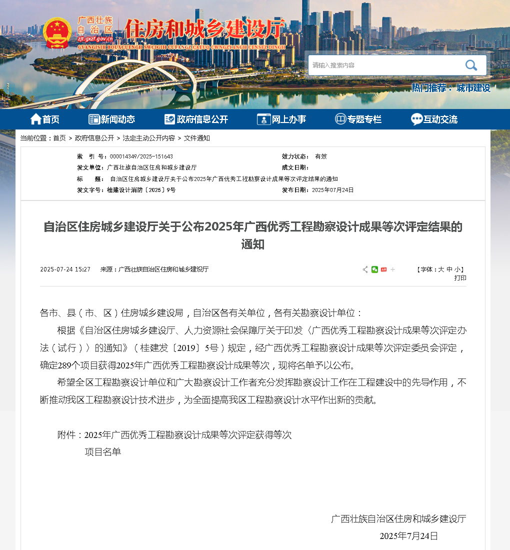 近日,廣西壯族自治區住房和城鄉建設廳公布了2025年廣西優秀工程勘察設計成果等次評定結果。我院共有9個項目獲獎。其中:優秀(公共)建筑設計獎8項:一等獎2項、二等獎4項、三等獎2項;優秀園林景觀設計獎1項:一等獎1項。