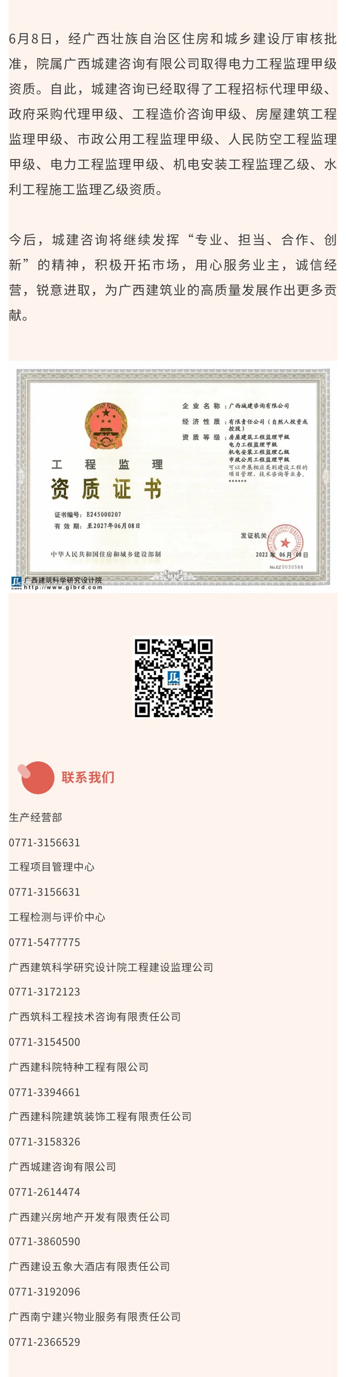 喜訊|院屬廣西城建咨詢有限公司取得電力工程監理甲級資質