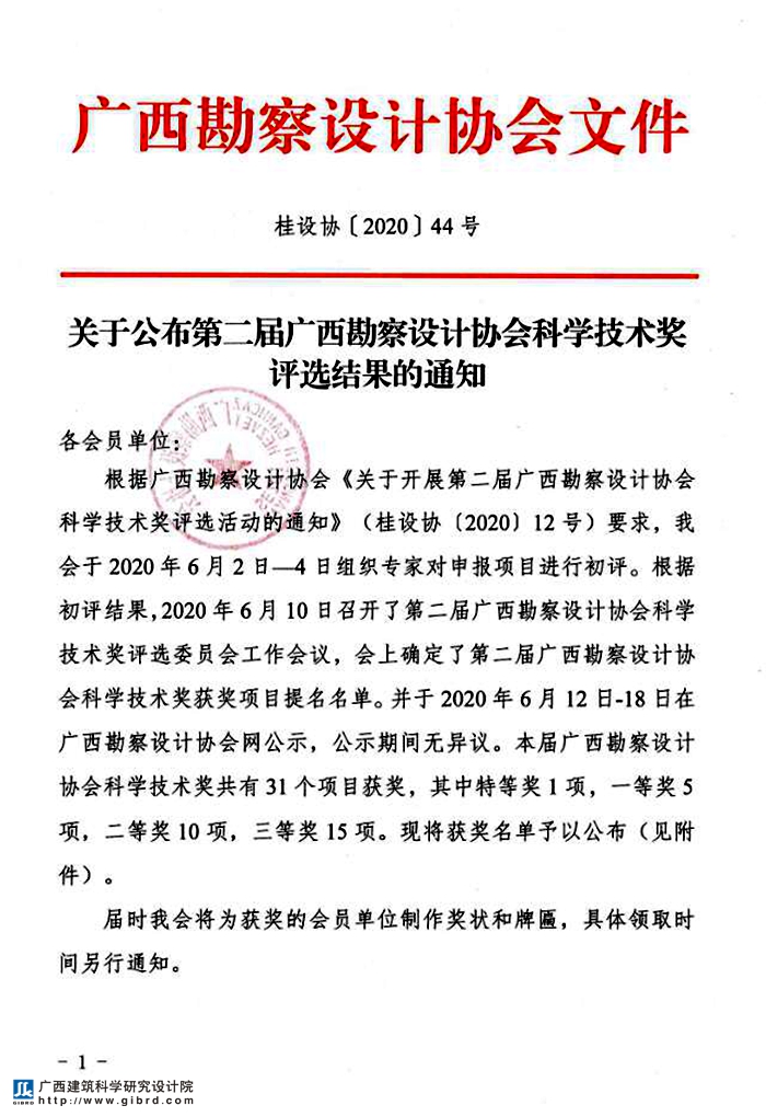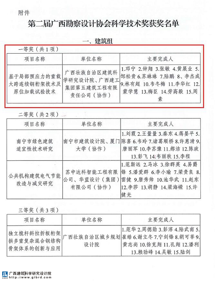 近日廣西勘察技術(shù)協(xié)會公布了第二屆廣西勘察技術(shù)協(xié)會科學(xué)技術(shù)獎評選結(jié)果,我院《基于局部預(yù)應(yīng)力的重載大跨連續(xù)鋼桁架技術(shù)及原位加載試驗技術(shù)》項目榮獲一等獎、《廣西夏熱冬暖地區(qū)立體綠化應(yīng)用研究》項目榮獲三等獎。