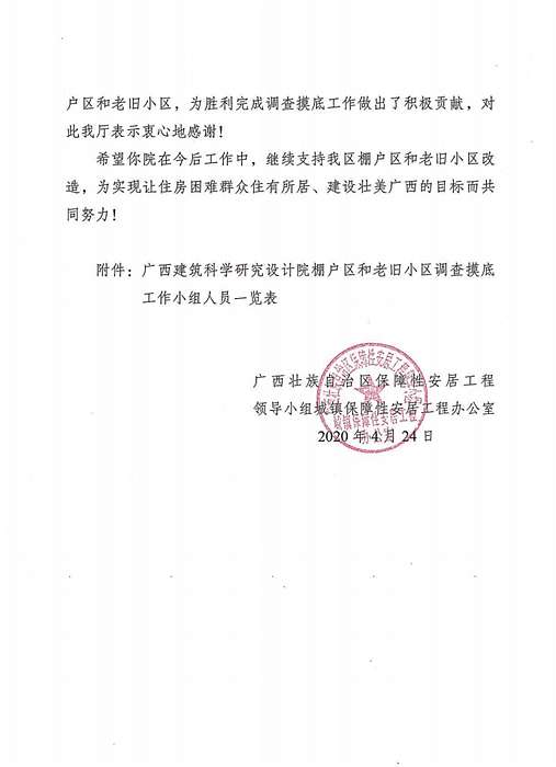 2019年9月至10月,我院選派李杰成副院長(zhǎng)等21名技術(shù)骨干積極參與自治區(qū)住建廳工作專班,全面摸清全區(qū)棚戶區(qū)和老舊小區(qū)現(xiàn)狀及做好后續(xù)改造工作。我院技術(shù)骨干每天工作15個(gè)小時(shí)以上,不辭辛苦、克難攻堅(jiān),踐行全心全意為人民服務(wù)宗旨,以強(qiáng)烈的責(zé)任感和使命感精準(zhǔn)識(shí)別棚戶區(qū)和老舊小區(qū),為勝利完成調(diào)查摸底工作做出了積極貢獻(xiàn),得到自治區(qū)住建廳的表?yè)P(yáng)和感謝。