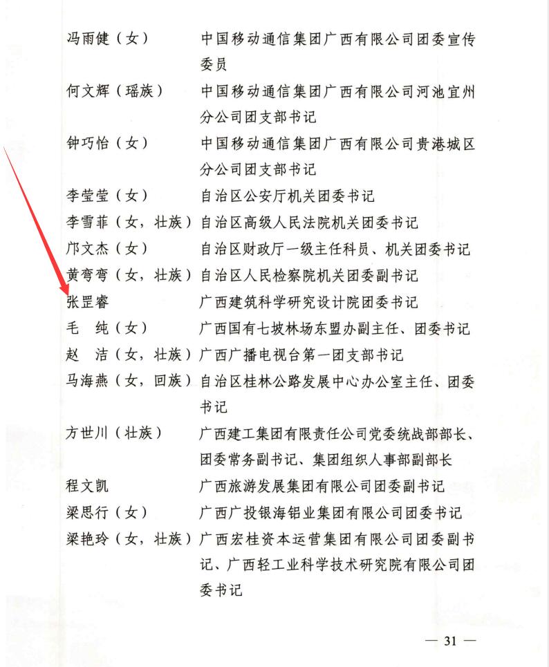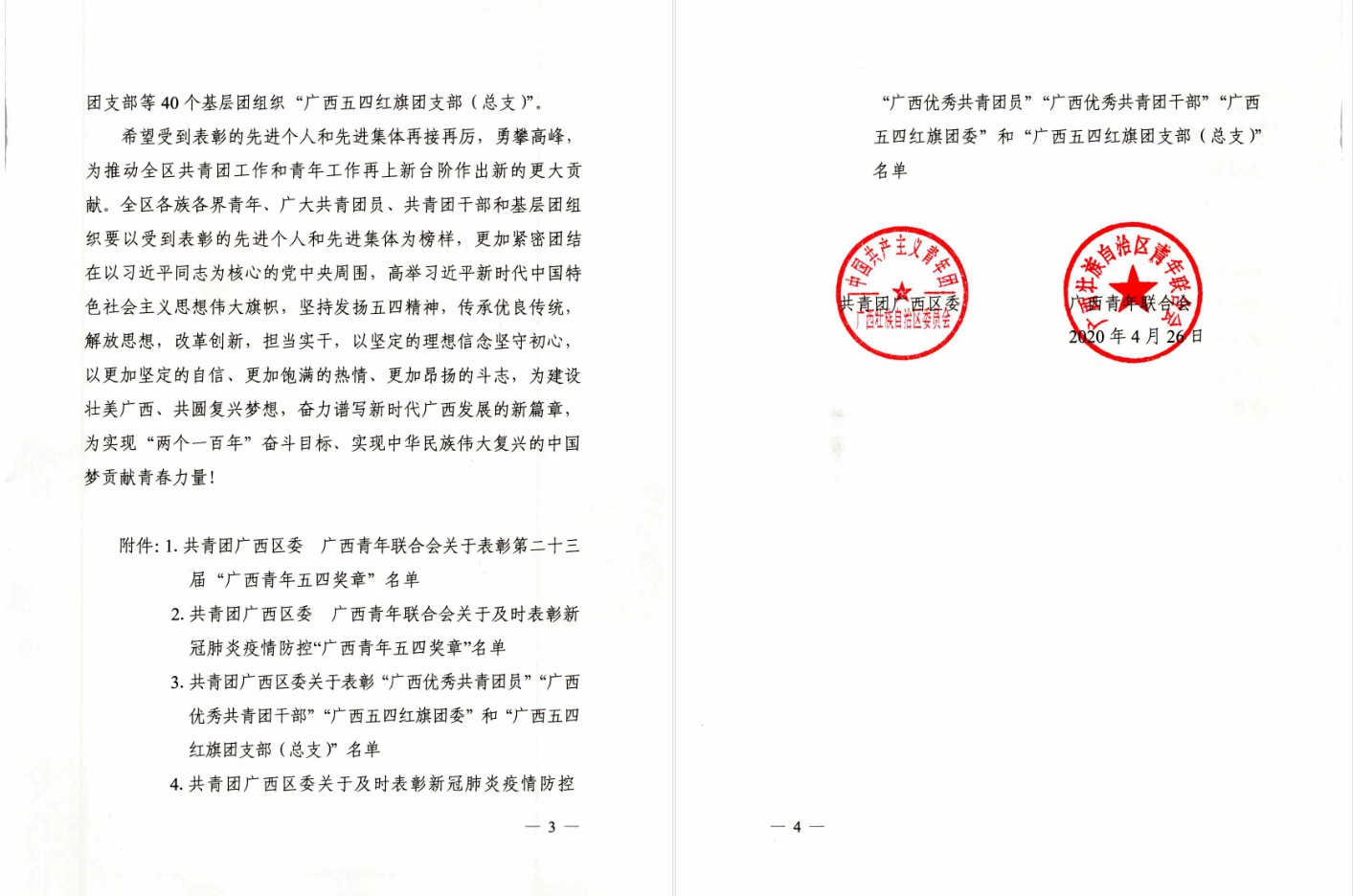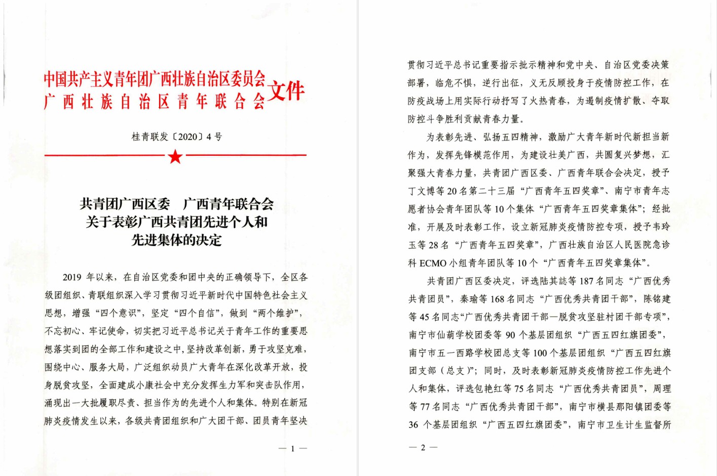 4月26日,共青團廣西區委辦公室印發了《共青團廣西區委 廣西青年聯合會關于表彰廣西共青團先進個人和先進集體的決定》(桂青聯發〔2020〕4號)文件,我院張罡睿同志被評為“廣西優秀共青團干部”。