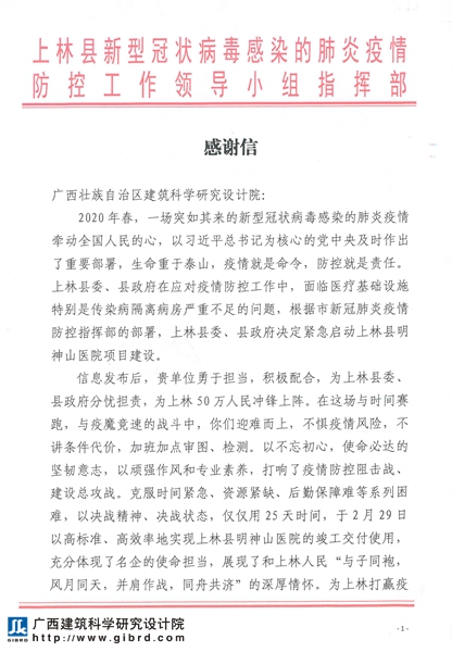 在新冠肺炎疫情阻擊戰中,我院發揚一方有難八方支援的精神,支援上林縣明神山醫院項目建設,以實際行動助力上林縣打贏疫情防控阻擊戰。我院職工,不畏懼疫情風險、迎難而上,以時不我待的精神,爭分奪秒、加班加點開展審圖、檢測等各項工作,用了僅僅25天時間,于2月29日高標準、高效率實現上林縣明神山醫院竣工交付使用,得到了上林縣廣大黨員干部和人民群眾的高度認可和點贊。