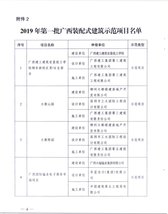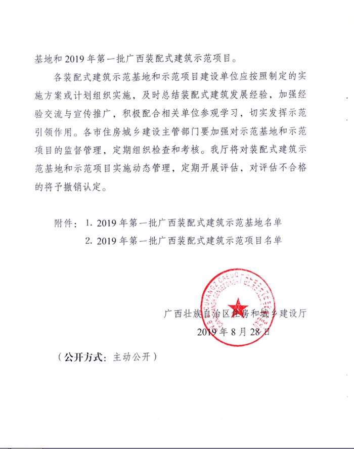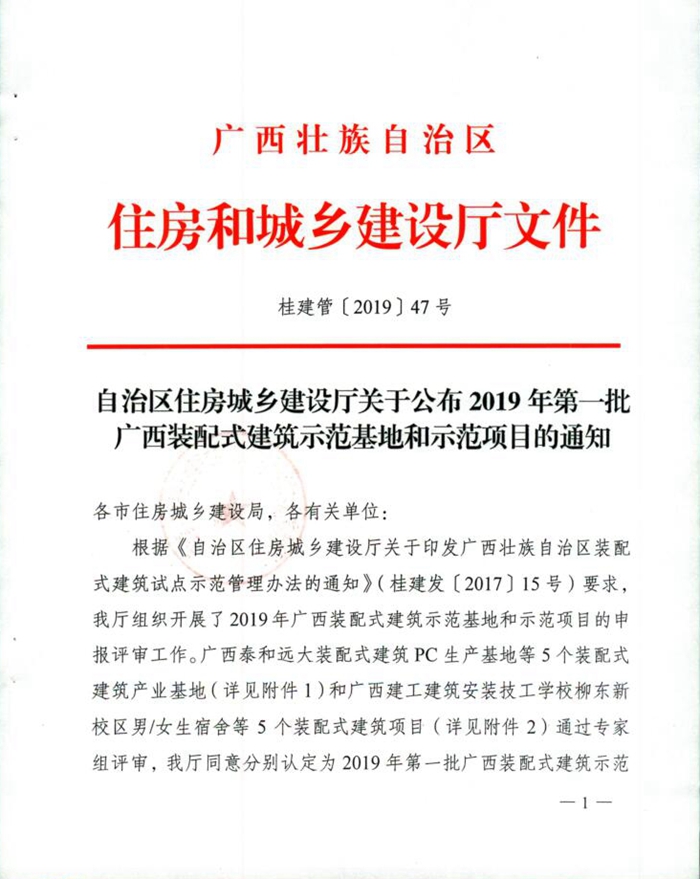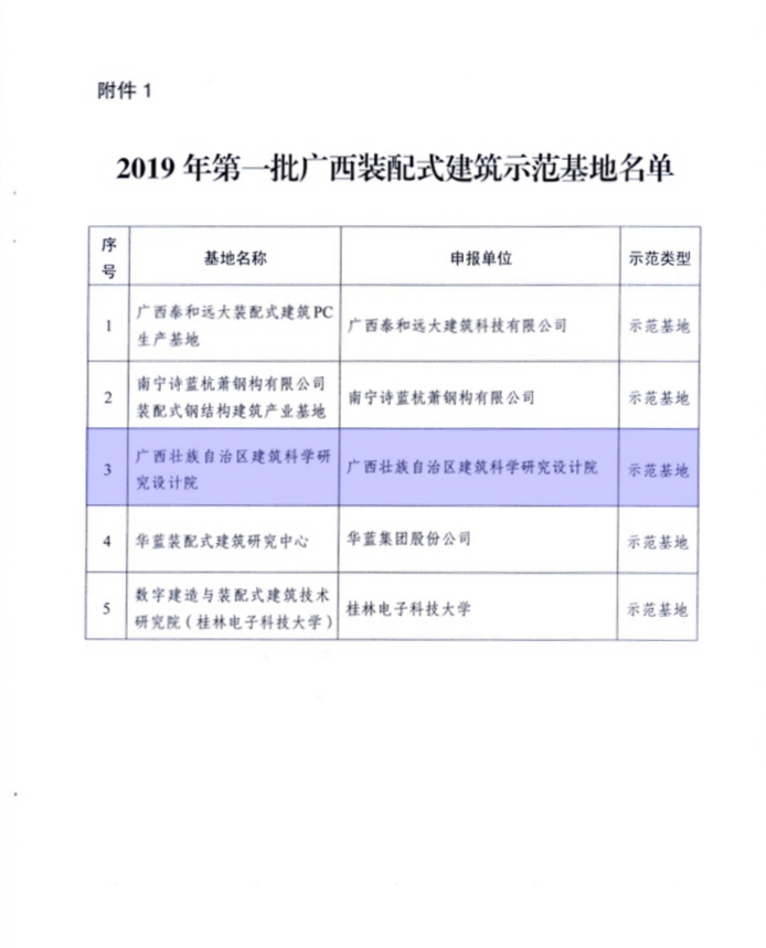 2019年8月29日,自治區(qū)住建廳印發(fā)了《自治區(qū)住房城鄉(xiāng)建設(shè)廳關(guān)于公布2019年第一批廣西裝配式建筑示范基地和示范項目的通知》(桂建管〔2019〕47號)文件,我院被認(rèn)定為2019年第一批廣西裝配式建筑示范基地。