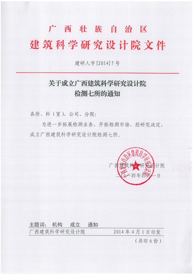 關(guān)于成立廣西建筑科學研究設(shè)計院 檢測七所的通知