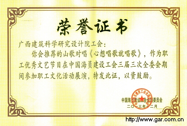 2013年12月5日,中國海員建設(shè)工會(huì)第三屆全國委員會(huì)第三次全體會(huì)議在廣西南寧召開。會(huì)議由中國海員建設(shè)工會(huì)副主席姚久強(qiáng)主持,全總副主席許振超出席會(huì)議,來自全國海員、公路運(yùn)輸、建筑和城建系統(tǒng)工會(huì)的171名代表參會(huì)。我院職工在三屆全三次全委會(huì)議職工文化展示中表演的一個(gè)具有濃厚廣西民族特色的山歌對唱節(jié)目《心想唱歌就唱歌》,在與會(huì)代表面前展現(xiàn)出壯鄉(xiāng)廣西獨(dú)特的服飾文化和民族風(fēng)情,獲得大家的一致好評。