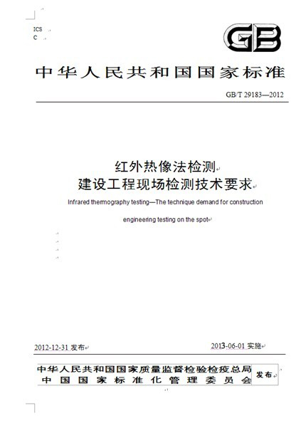 我院參編的中華人民共和國國家標準GB/T 29183—2012《紅外熱像法檢測建設工程現場通用技術要求》于2012年12月31日由國家質量監督檢驗檢疫總局、國家標準化管理委員會批準,正式發布中華人民共和國國家標準公告2012年第41號,將于2013年6月1日起實施。