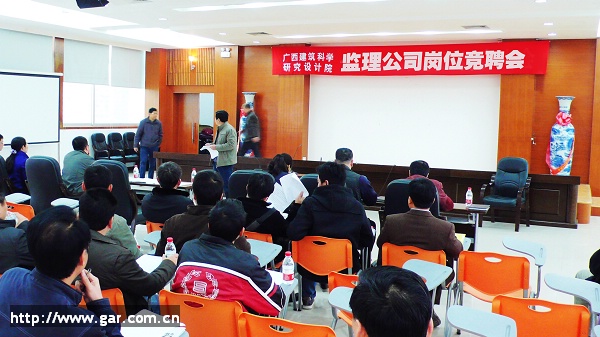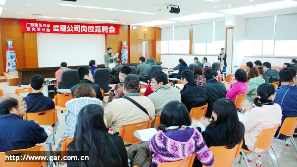 為加強管理,調動員工工作積極性,發掘和培養企業內部優秀管理人才,進而建立有效的激勵與競爭機制,院監理公司于2011年3月26日舉辦崗位競聘會。會議由監理公司陳群毓總經理主持,院辦公室樊振北副主任、院企劃咨詢中心龐耀國主任、監理公司副經理等6名資深專業專家組成評委小組,監理公司領導、各監理部總監以及員工等50余人參加了此次競聘大會。參加競聘的同志分別從自己對擬聘崗位的認識、近年來工作業績、競聘該職位的主要優勢和上任后的工作設想等幾個方面進行了精彩的競聘演講和現場答辯。競聘演講結束后,專業評審小組評委對每一位競聘者現場打分,并進行民主測評。