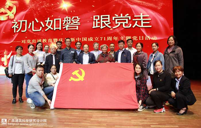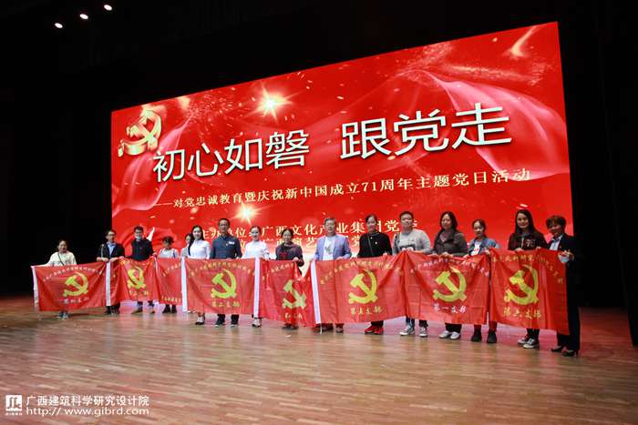 10月9日,受廣西文化產(chǎn)業(yè)集團(tuán)邀請(qǐng),院黨委書記俸尚東帶領(lǐng)部分黨員共計(jì)23人到南寧劇場(chǎng)參加該集團(tuán)舉辦的“初心如磐跟黨走”對(duì)黨忠誠(chéng)教育活動(dòng)暨慶祝新中國(guó)成立71周年主題黨日活動(dòng),院黨委副書記何峰、紀(jì)委書記曹天仕一同前往參加活動(dòng)。