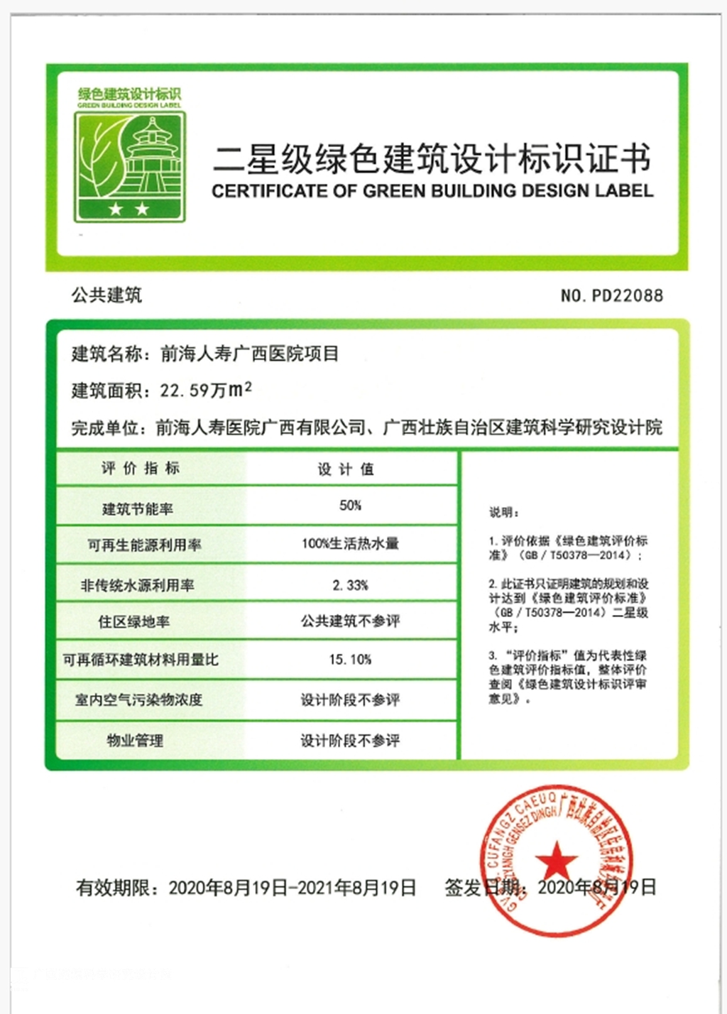 前海人壽廣西醫(yī)院項(xiàng)目,建筑面積22萬平方米,獲得二星級綠色建筑設(shè)計(jì)標(biāo)識(shí)。